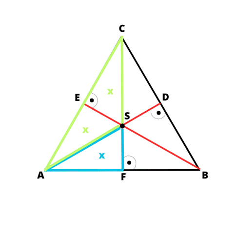 W trójkącie równobocznym wszystkie trzy wysokości przecinają się w jednym punkcie, który można określić poprzez jego położenie. Warto zauważyć, że wysokości te dzielą trójkąt równoboczny na sześć trójkątów prostokątnych o identycznych wymiarach. Zwróć uwagę na trójkąt AFC i odcinek AS, który dzieli go na dwa trójkąty — AFS i ASC. Teraz zastanów się, jaki jest stosunek pól tych trójkątów.