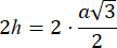 Sześciokąt foremny składa się z 6 trójkątów równobocznych. Jedna przekątna składa się z dwóch wysokości, dlatego, aby obliczyć jej długość skorzystaj ze wzoru na wysokość trójkąta równobocznego:
