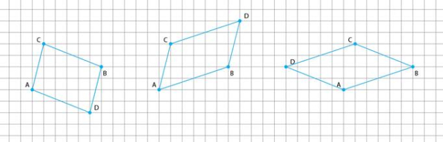 W tym zadaniu musisz zaznaczyć w zeszycie w kratkę punkty A, B, C tak jak na rysunku do ćwiczenia 3. Następnie, twoim zadaniem jest znalezienie takiego punktu D, aby punkty A, B, C, D były wierzchołkami równoległoboku. Musisz rozpatrzeć wszystkie przypadki w tym zadaniu.