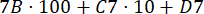Przedstaw wyrażenie, dzięki któremu arkusz kalkulacyjny oblicza liczbę trzycyfrową na podstawie cyfr podanych w trzech osobnych komórkach – B7, C7 oraz D7.
