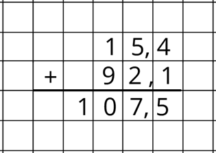 W tym zadaniu uzupełnij odpowiednimi cyframi zapisy pisemnego dodawania liczb dziesiętnych.