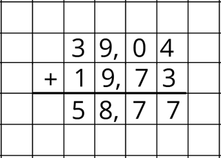 W tym zadaniu uzupełnij odpowiednimi cyframi zapisy pisemnego dodawania liczb dziesiętnych.