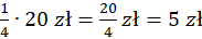 Oblicz cenę każdej z zakupionych przez Kasię rzeczy, a następnie odejmij ich sumę od kwoty początkowej. Cenę każdego towaru oblicz zapisując iloczyn ułamka i kwoty jaką miała Kasia.