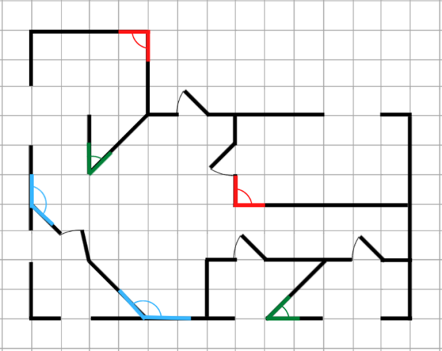 W tym zadaniu przerysuj do zeszytu plan przedstawiony w zadaniu i zaznacz na nim kolorem zielonym co najmniej 2 kąty ostre, czerwonym co najmniej 2 kąty proste, niebieskim co najmniej 2 kąty rozwarte.