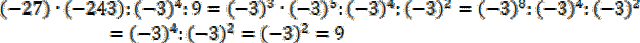 Najpierw zapisz każdą liczbę w postaci potęgi o podstawie (-3), a następnie wykorzystaj wzory na mnożenie i dzielenie potęg o takich samych podstawach:
