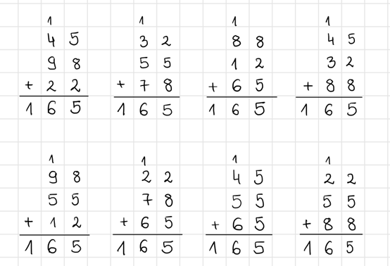 Zapisz sumy pisemnie dla każdego wiersza, kolumny i przekątnej kwadratu. Sprawdź czy każdy wynik jest sobie równy.