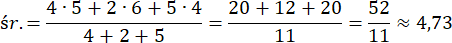 W tym zadaniu obliczy średnią ocen Ani, wiedząc, że otrzymała: 4 piątki, 2 szóstki i 5 czwórek, a następnie wynik zaokrąglij do dwóch miejsc po przecinku.