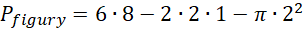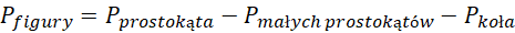 Od pól większych figur odejmij pola mniejszych. Pamiętaj, że pole prostokąta i kwadratu to iloczyn ich boków, a pole koła to iloczyn kwadratu promienia i liczby PI.