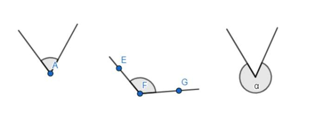 Kąt A — ostry, kąt EFG — rozwarty, kąt α — wklęsły