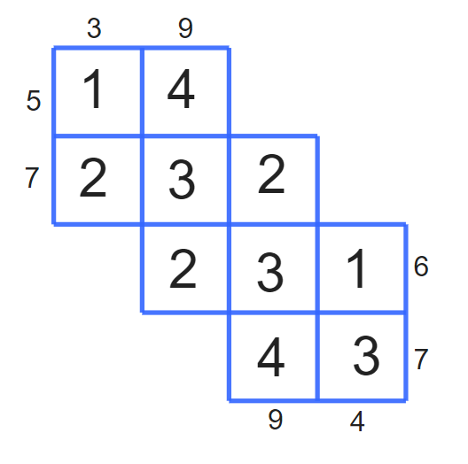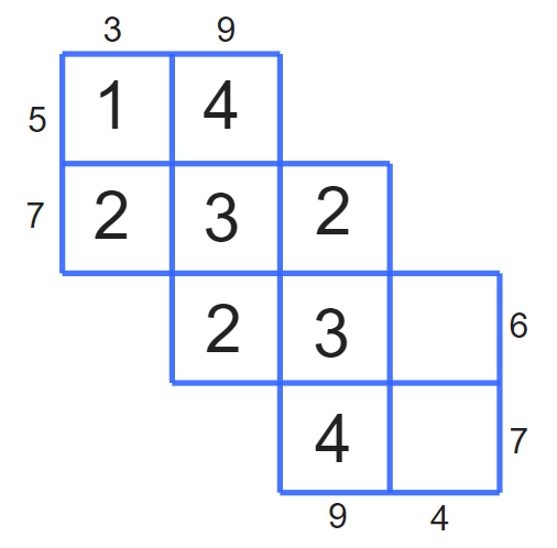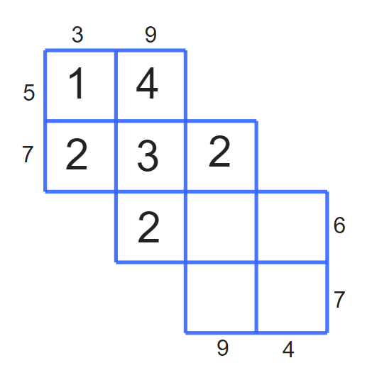 Musisz uzupełnić ten diagram cyframi 1, 2, 3, 4 w następujący sposób: suma cyfr w każdym wierszu i kolumnie musi być równa liczbie zapisanej przy niej.