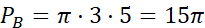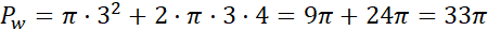 Pole powierzchni przedstawionej bryły to suma składająca się z pola powierzchni bocznej walca o promieniu podstawy 3 i wysokości 4, pola jego jednej podstawy oraz pola powierzchni bocznej stożka o promieniu 3 i wysokości 4.