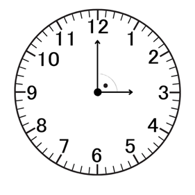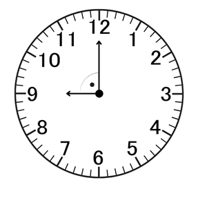 Wskazówki na tarczy zegara tworzą kąt prosty o godzinie 9:00, 3:00 oraz 15:00.
