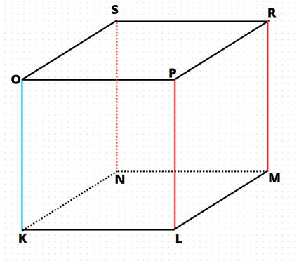 W tym zadaniu musisz zaznaczyć kolorem czerwonym wszystkie krawędzie równolegle do zaznaczonej na niebiesko krawędzi w sześcianie KLMNOPRS.