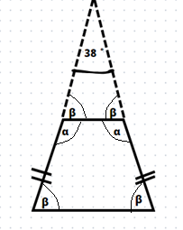 Łączna suma miar kątów wewnętrznych trapezu wynosi 360˚. Aby obliczyć wartość kąta β, należy od sumy kątów w trójkącie, odjąć kąt 38˚ i podzielić uzyskaną wartość na 2, a w celu znalezienia wartości kąta α, należy odjąć kąt β od 180˚.