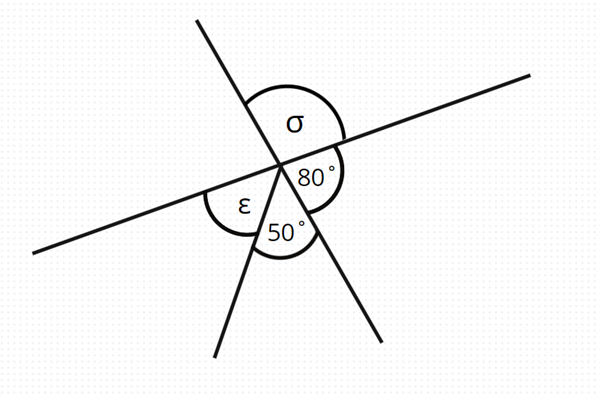 W tym zadaniu musisz obliczyć miary kątów σ i ε, wiedząc, że σ jest kątem przyległym do kąta 80˚, a ε jest kątem przyległym do kątów 50˚ i 80˚.