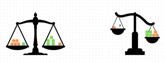 Na pierwszej wadze masa 5 kulek i jednego sześcianu jest równa masie 5 sześcianów i jednej kulki. Po ułożeniu równania, należy przemieść masy kulek na jedną jego stronę, a sześcianów – na drugą. Z otrzymanego równania widzimy, że masa sześciany jest równa masie kulki.