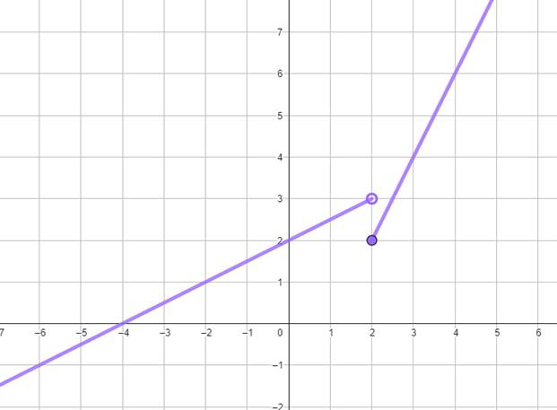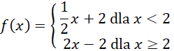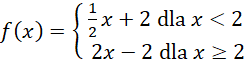 Najpierw sporządź wykres funkcji. Narysuj podane fragmenty funkcji w odpowiadających im przedziałach. Pamiętaj przy zaznaczaniu krańców prostej, że jeżeli punkt ten należy do dziedziny, oznaczamy go wypełnionym kółkiem, a jeżeli nie należy, oznaczamy to kółkiem niewypełnionym.
