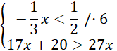 Przy pomocy obustronnych przekształceń nierówności wewnątrz układu, oblicz jego zbiór rozwiązań. Następnie przedstaw go za pomocą przedziału. Pamiętaj o odwróceniu znaku nierówności przy obustronnym mnożeniu przez liczbę ujemną.