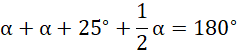 Wykorzystujemy relacje zawarte w treści zadania wraz z wiedzą o sumie kątów wewnętrznych trójkąta i układamy odpowiednie równanie.