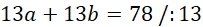 Wiedząc, że suma dwóch liczb naturalnych jest równa 78, oraz że ich największym wspólnym dzielnikiem jest 13, podaj te liczby.