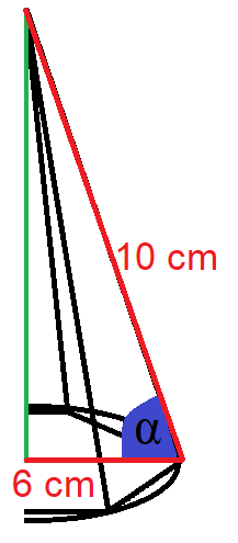 Jest podany ostrosłup prawidłowy 100-kątny, którego boczna krawędź ma 10 cm, a promień okręgu opisanego na jego podstawie to 6 cm. Twoim zadaniem jest wyznaczyć kąt nachylenia krawędzi bocznej do podstawy. Wynik podaj z dokładnością do jednego stopnia.