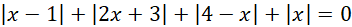 Zauważmy, że równanie to ma po prawej stronie 0, a po lewej stronie sumę wartości bezwzględnych. Wartości bezwzględne z definicji są większe lub równe 0, więc aby ich suma była równa 0 to wszystkie z nich muszą być także równe 0. Zauważmy też, że wszystkie mają w sobie tę samą zmienną x. Dlatego też, jeśli jedna z nich jest równa 0 dla jakiejś liczby x, to wszystkie inne też muszą być równe 0 dla dokładnie tej samej liczby x. Obliczmy więc wartość x, dla której jedna z nich jest równa 0, a następnie sprawdźmy czy dla tej samej liczby pozostałe wartości bezwzględne też się zerują.