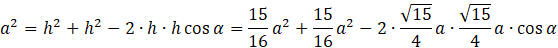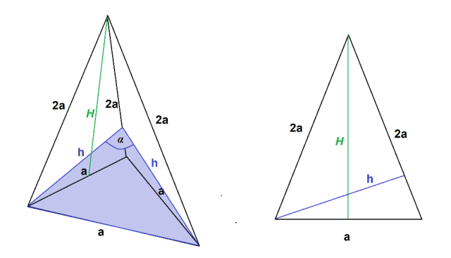 W ostrosłupie prawidłowym trójkątnym krawędź boczna jest dwukrotnie dłuższa od krawędzi podstawy. Twoim zadaniem jest obliczenie cosinusa kąta pomiędzy dwoma, sąsiadującymi ze sobą ścianami bocznymi ostrosłupa.