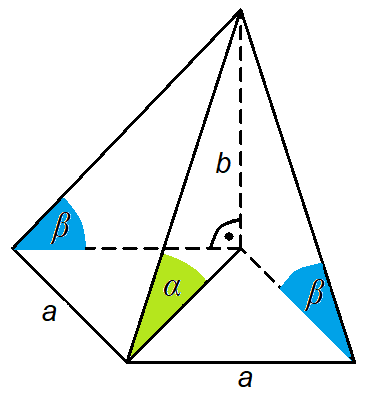 Masz podany ostrosłup prawidłowy czworokątny o krawędzi podstawy a oraz krawędzi bocznej b, która jest prostopadła do płaszczyzny podstawy. Twoim zadaniem jest wyznaczenie tangensów kątów nachylenia pozostałych bocznych krawędzi do płaszczyzny.