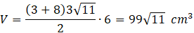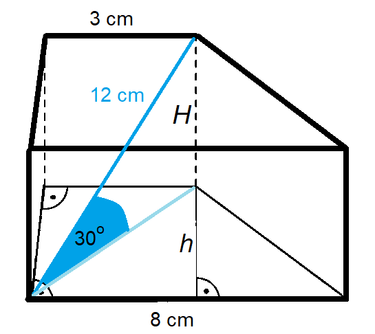 Oblicz objętość graniastosłupa, którego podstawą jest trapez prostokątny. Podstawy tego trapezu mają długości 3 cm oraz 8 cm, a krótsza przekątna graniastosłupa ma długość 12 cm i tworzy z podstawą trzydziestostopniowy kąt.