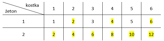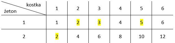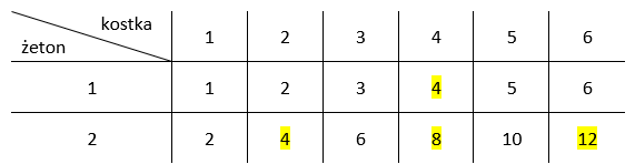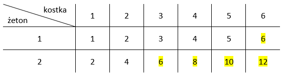 Najlepszym rozwiązaniem tego zadania jest narysowanie dla każdego zdarzenia losowego tabeli z wszystkimi możliwymi wynikami tych rzutów. Tę tabelę dla ułatwienia sobie zaznaczania, możesz wypełnić iloczynami oczek wyrzuconych z kostki i żetonu. Następnie zaznacz które z tych kombinacji spełniają warunek z danego zdarzenia losowego. Zauważ, że cała tabela reprezentuje przestrzeń zdarzeń elementarnych, więc musisz policzyć, ile jest komórek w tabeli. Najszybciej to zrobisz przez pomnożenie ilości wierszy i komórek. Te same tabele będą dla każdego zdarzenia losowego, więc możesz na początku obliczyć ilość elementów z przestrzeni zdarzeń elementarnych. Natomiast zdarzeniem losowym będą zaznaczone przez ciebie rzuty i także musisz policzyć, ile ich jest. Dalej korzystasz z klasycznej definicji prawdopodobieństwa.