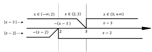 Rozważamy trzy przypadki, w których zapisujemy nierówność bez symbolu wartości bezwzględnej. Rozwiązujemy ją i sprawdzamy, które liczby z otrzymanego przedziału spełniają rozważany warunek, wyznaczając iloczyn przedziału z warunku oraz otrzymanego przedziału z nierówności: