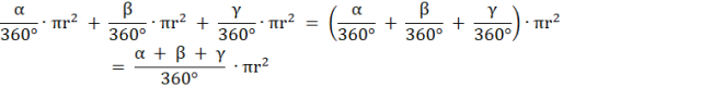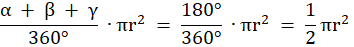 Aby obliczyć pole zacieniowanej części trójkąta, od pola trójkąta odejmij sumę pól trzech wycinków kół o promieniu 2 wyznaczonych przez β, α i γ.