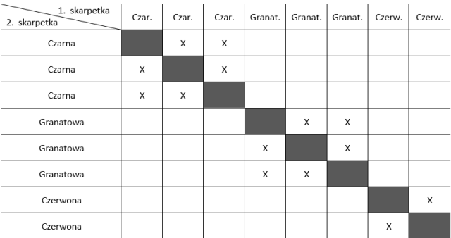 Najlepszym rozwiązaniem tego zadania jest narysowanie tabeli z wszystkimi możliwymi wynikami losowania. W kolumnach niech będą wyniki pierwszego losowania, zaś w wierszach – drugiego. Każdą skarpetkę musisz potraktować osobno, pomimo że są tego samego koloru. Musisz odrzucić sytuacje, w których dwa razy losuje się tą samą skarpetkę, gdyż po jej wylosowaniu wyciągasz ją z szuflady, czyli nie bierze udziału w dalszym losowaniu. Zdarzeniem losowym jest oczywiście wylosowanie skarpetek w dwóch różnych kolorach. Jednak zauważ, że to zdarzenie stanowi większą część tabeli. Więc dla ułatwienia rozwiązania zadania warto zaznaczyć zdarzenie przeciwne, czyli wylosowanie skarpetek w tych samych kolorach. Zaznacz które z tych kombinacji spełniają warunek z zadania. Zauważ, że cała tabela reprezentuje przestrzeń zdarzeń elementarnych, więc musisz policzyć, ile jest komórek w tabeli. Najszybciej to zrobisz przez pomnożenie ilości wierszy i komórek i odjęciem tych które odrzucasz. Natomiast zdarzeniem losowym będą zaznaczone przez ciebie wyniki losowania i także musisz policzyć, ile ich jest. Dalej korzystasz z klasycznej definicji prawdopodobieństwa oraz z definicji zdarzenia przeciwnego.