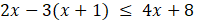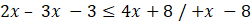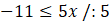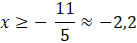 Przenieś wszystkie wartości z „x” na jedną stronę nierówności, natomiast liczby na przeciwną stronę. Podziel obie strony nierówności przez 5. Rozwiązaniem jest najmniejsza liczba całkowita większa od –2,2, czyli –2.