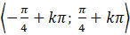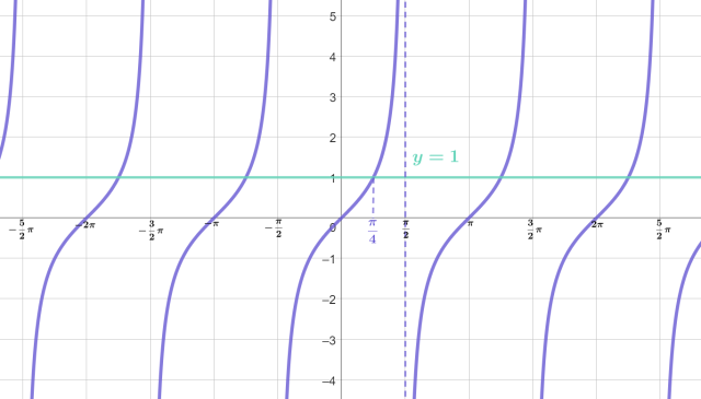Przedziałów takich jest nieskończenie wiele, a różnica pomiędzy odpowiednimi punktami w kolejnych z nich wynosi π, co wynika z okresowości funkcji tangens. Zatem: