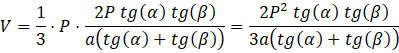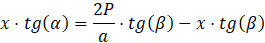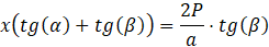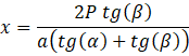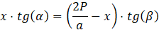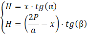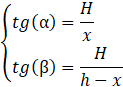 Wysokość dzieli trójkąt zawierający kąty α oraz β na dwa trójkąty prostokątne o wspólnej przyprostokątnej będącej wysokością bryły. Ustaw jako niewiadomą 𝑥 długość odcinka od wierzchołka przy kącie α do spodka wysokości bryły. Ułóż układ równań za pomocą funkcji trygonometrycznych: