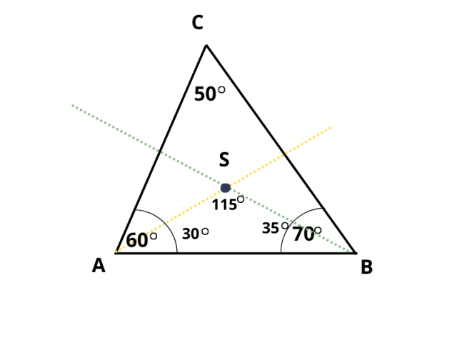 Miary kątów trójkąta ABS: 30°, 35°, 115°.