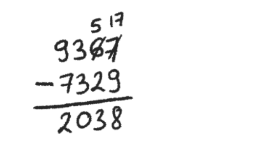 W tym zadaniu musisz wykonać obliczenie pisemne: 9367 – 7329.