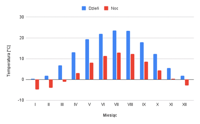 W tym zadaniu przedstaw w postaci diagramu słupkowego średnie miesięczne temperatury w dzień i w nocy dla Krakowa, wykorzystując dane znalezione w internecie.