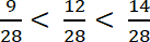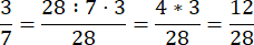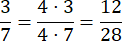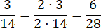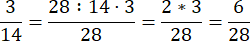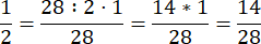 Znajdź liczbę, która dzieli się przez 2, 7, 4, 14 i 28, a następnie sprowadź podane ułamki do takiego mianownika.