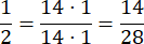 Wspólnym mianownikiem będzie liczb 28, ponieważ jest to najmniejsza liczba, która dzieli się przez 2, 7, 4, 14 i 28. Podane ułamki rozszerzamy do mianownika 28: