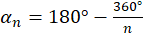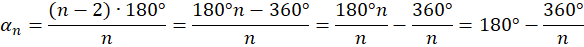 Znając wzór na obliczenie miary kąta wewnętrznego wielokąta foremnego o n bokach przekształć go. Wykonaj mnożenie w liczniku i uprość otrzymaną postać: