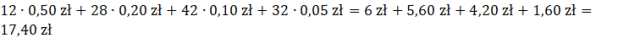W tym zadaniu musisz na podstawie treści policzyć oszczędności Tosi. Wiesz, że ma 12 pięćdziesięciogroszówek, 28 dwudziestogroszówek, 42 dziesięciogroszówki i 32 pięciogroszówki.