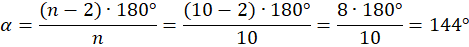 Najpierw, wykorzystując wzór oblicz miarę kąta wewnętrznego dziesięciokąta: