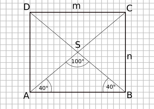 Oznaczmy przez , , i kolejne wierzchołki trójkąta. Niech będzie punktem przecięcia przekątnych. Wiemy, że kąt i kąt mają miary i są kątami trójkąta . Z własności kątów trójkąta wiemy, że kąt między przekątnymi ma miarę .