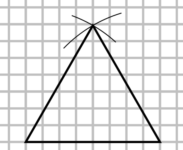 Kratka na rysunku ma bok długości . Skorzystaj z tego, że obwód trójkąta równobocznego o boku wynosi . Najpierw oblicz, że długość boku nieprzeskalowanego trójkąta wynosi . Narysuj bok długości i z jego końców poprowadź łuki o promieniach . Punkt przecięcia tych łuków wyznaczy trzeci wierzchołek trójkąta.Po wykonaniu rysunku zmierz długość boku małego trójkąta i oblicz jego obwód.