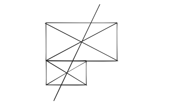Narysuj przekątne zielonego prostokąta. Zaznacz wyraźnie ich punkt przecięcia. Narysuj przekątne pomarańczowego prostokąta. Zaznacz wyraźnie ich punkt przecięcia. Używając linijki, narysuj prostą, która przechodzi przez oba punkty przecięcia przekątnych. Dzieli ona oba prostokąty na połowy.