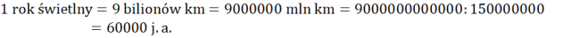 W tym ćwiczeniu musisz zamienić rok świetlny na kilometry, a następnie na jednostki astronomiczne. Skorzystaj z ciekawostki. 1 j. a. to 150000000 km.
