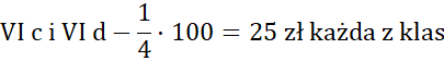 Odp.: Klasa VI a otrzyma 30 zł, klasa VI b - 20 zł, klasy VI c i VI d po 25 zł.