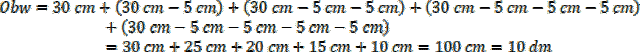 Najdłuższy bok ma długość 30 cm, a każdy kolejny jest o 5 cm krótszy od poprzedniego. Obwód tego pięciokąta możesz zapisać następująco: